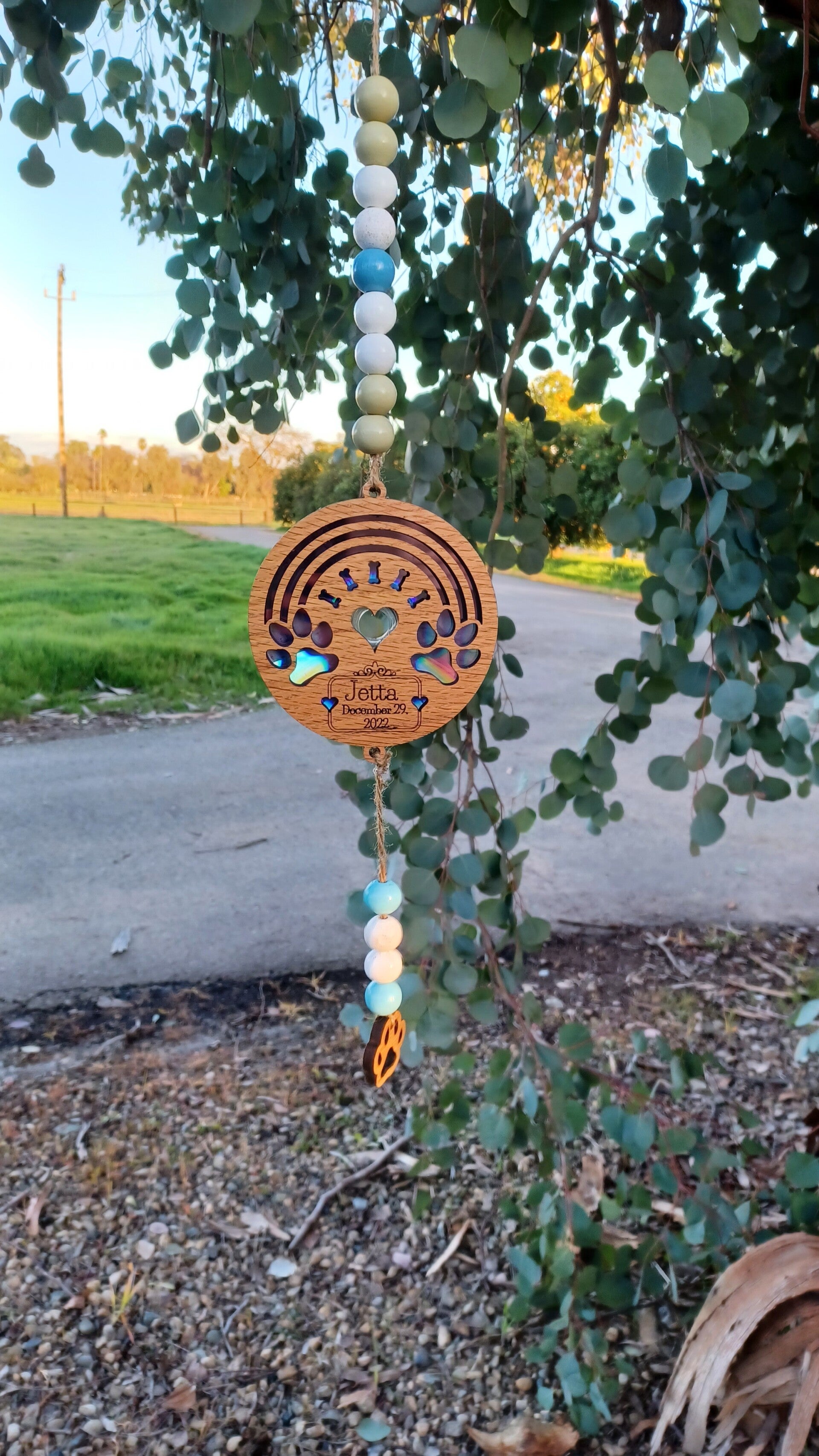 Custom Rainbow Bridge sun catcher made from oak wood or walnut and repurposed CDs. "When rainbows dance, your loved one is near..."